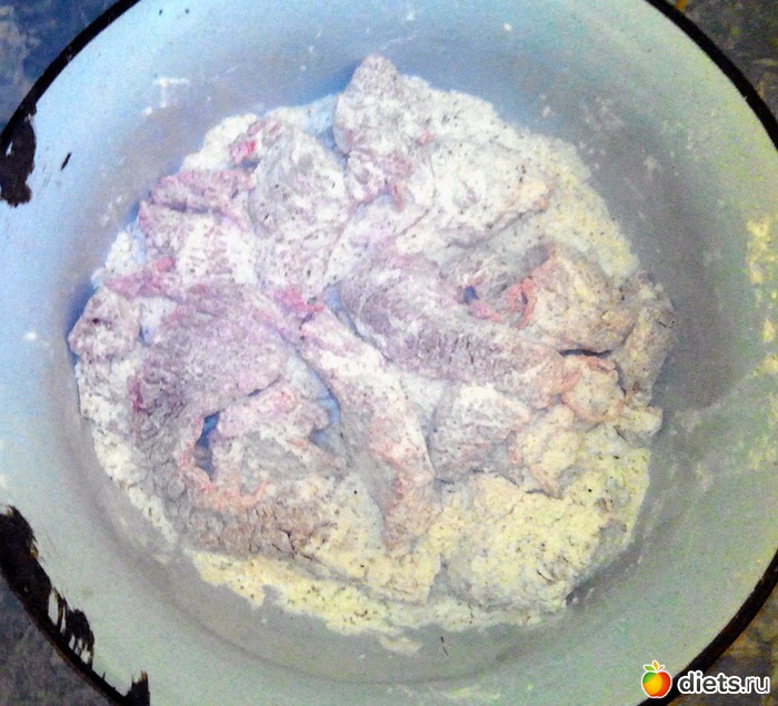 Обвалял в ней мясо.