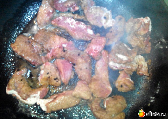 Убрал мясо со сковороды, добавил немного масла и положил лук.