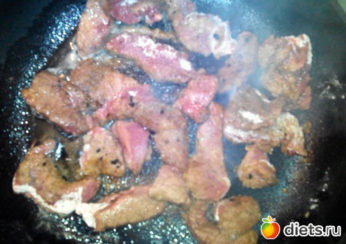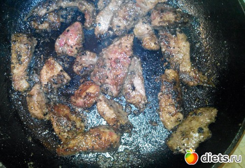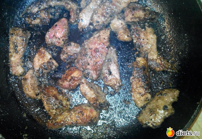 Хорошенько разогрел сковороду, капнул на нее немного масла и выложил мясо.