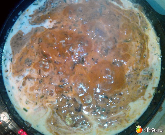 Обжарил лук, еще и укропа добавил... Положил остатки панировки. Еще хорошенько прогрел, потом добавил томатную пасту. Обжарил все это дело и залил сывороткой от мечниковской простостокваши (как раз греческий йогурт поставил стекать). Прокипело оно и я залил туда еще и ряженки. Довел до кипения и поставил тушиться... Правда, немного перестарался и соус начал слегка пригорать, но я вовремя выключил огонь и хорошенько перемешал.