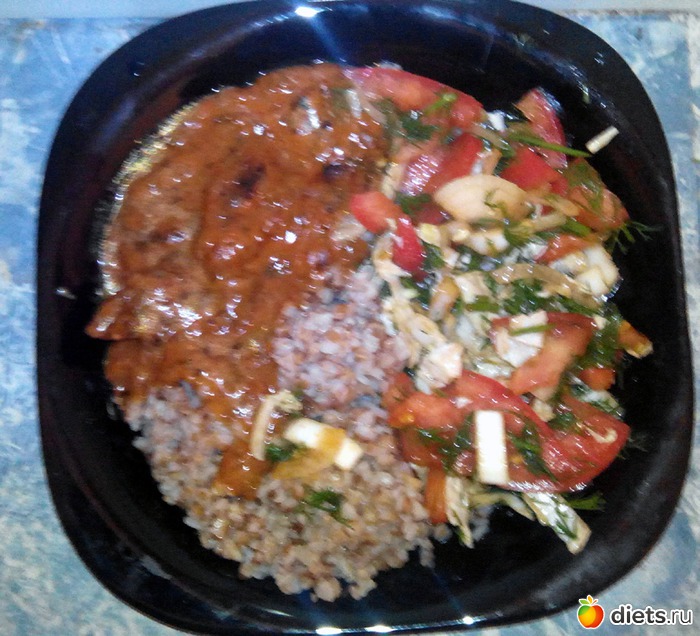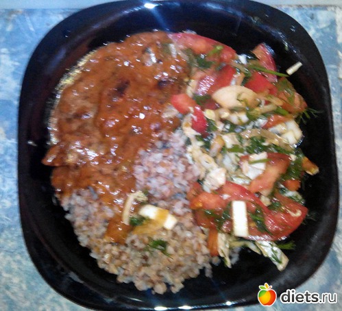 Салат из помидорки, лука, укропа и пекинки. Гречка (переварил). И беф-строганов по-советски.