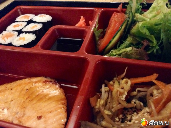По возможности диетический бенто-ланч: лосось, тушеные ростки сои, салат-микс и ролл.
