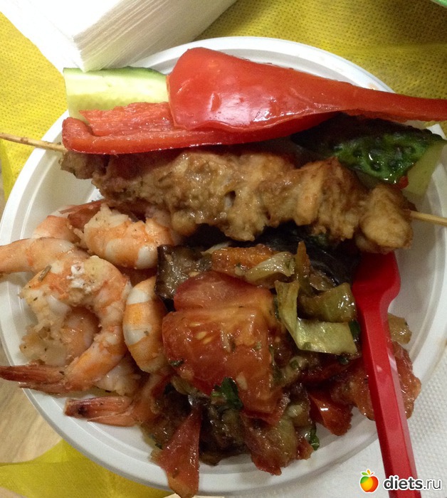 У меня на тарелке диаметром 18 см отварные креветки, шашлычок из курицы, соте из баклажанов и перчик-огурчик.