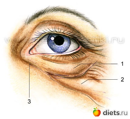 1 - Жировая "грыжа"; 2 - Малярный "мешок"; 3 - Носослезная борозда