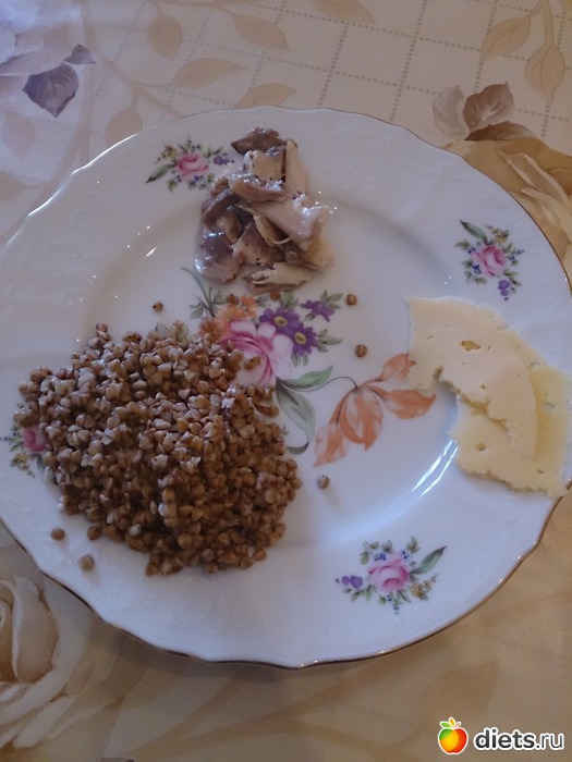 Запаренная час назад гречка (60 г в сухом виде), 70 г вареного карпа, 2 кусочка сыра.)