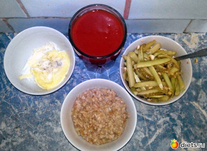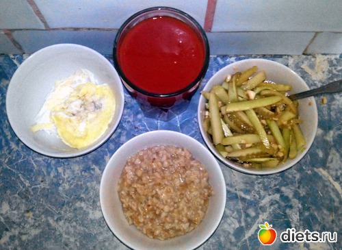 Сок, овсянка, яйцо и огурец.