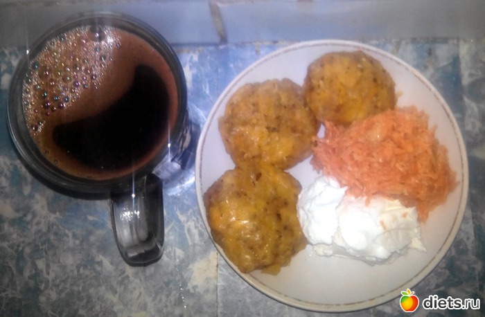 Кофе, шарики эти, морковь с чесноком и греческий йогурт.