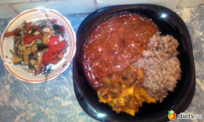 Салат, гречка, остатки вчерашней тыквы и беф-строганов по-советски.