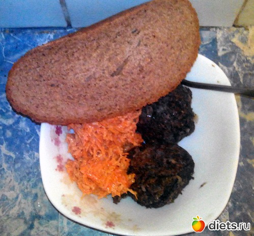 Пара грибно-куриных котлеток, морковь с чесноком и хлеб.