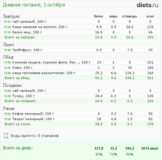 Сегодня занималась первый раз. Я знала, что будет тяжело. Но, что я так ослабла - я даже представить себе не могла... На втором подходе уже тяжело было. Майку хоть выжимай. Тренер дал план питания. Достаточно однообразный. Никого, думаю, не удивлю, что туда входит каша овсяная, на молоке правда, белки яиц (150г - 5 штук) Это утром. Второй завтрак - грейпфрут (100 г)...