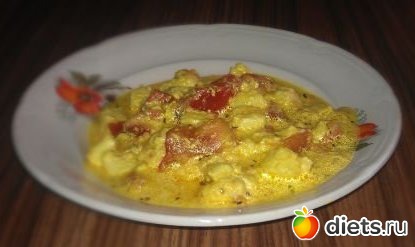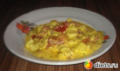 После заливаем равномерно смесью «сметана-молоко-соль», посыпаем приправами и оставляем будущий вегетарианский омлет тушиться под крышкой на 5-7 мин.