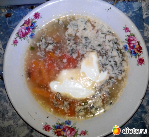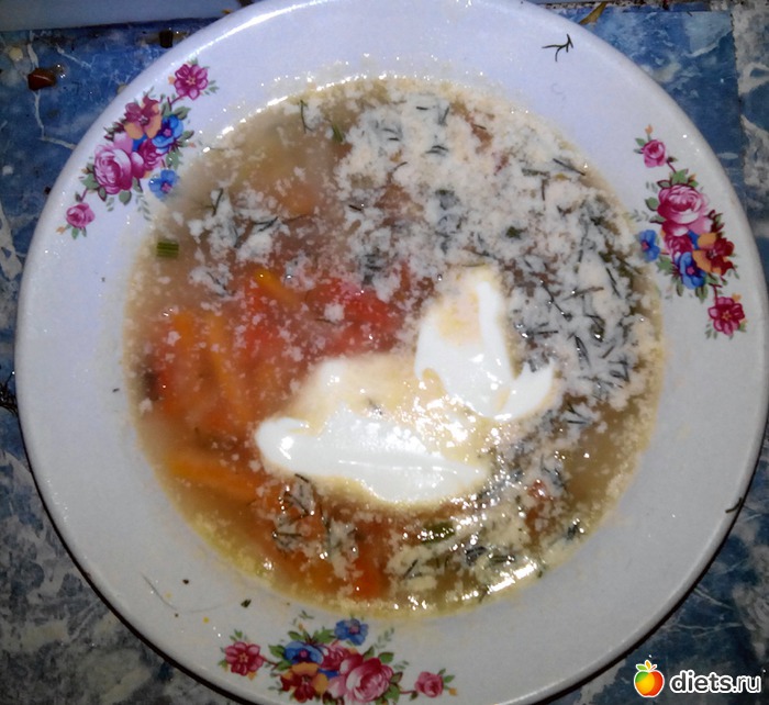 Первое... Совершенно легкий вышел супчик. Варил его на картофельном отваре. Мне всегда его очень жалко выливать и поэтому я его, иной раз, использую как бульон. Вот и сейчас... Слил отвар, положил в кастрюлю нарезанную соломкой морковь, болгарский перец и лук. Когда овощи сварились заправил суп небольшим количеством сливочного масла и натертым на терке колбасным сыром. Сыр, кстати, действительно сыр, а не пресловутый сырный продукт. Этот делается без добавок и именно на молоке. Стоит он, конечно, дороже. Но оно того стоит.