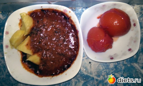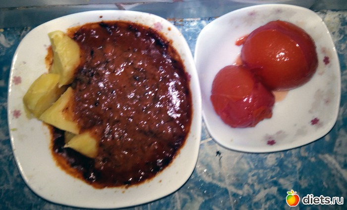 Та самая вареная картошка, от которой и остался отвар. Остатки беф-строганова и пара помидорок в собственном соку.