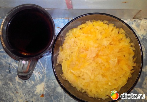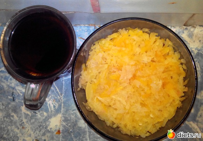 Смесь из тыквы и яблока, запеченная в микроволновке и чай. Кстати, сверху на тыкво-яблоко положил немного сметаны и вышло совсем вкусно.