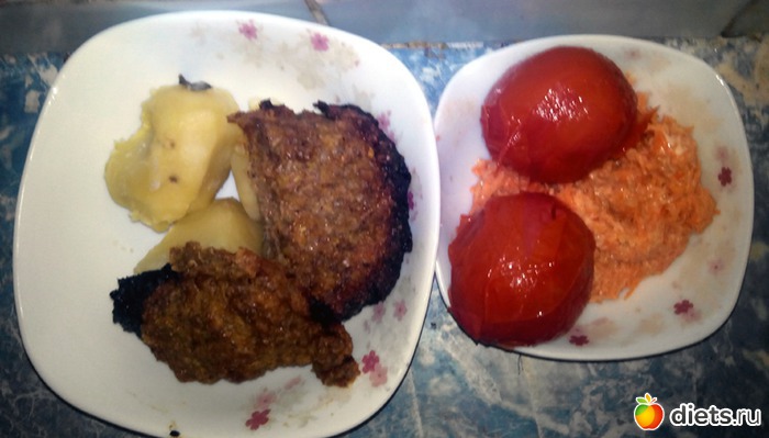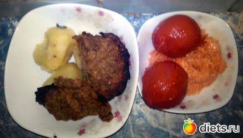 Картошка, пара вчерашних котлеток, остатки моркови с чесноком и еще пара помидорок.