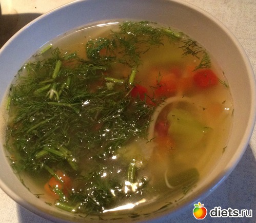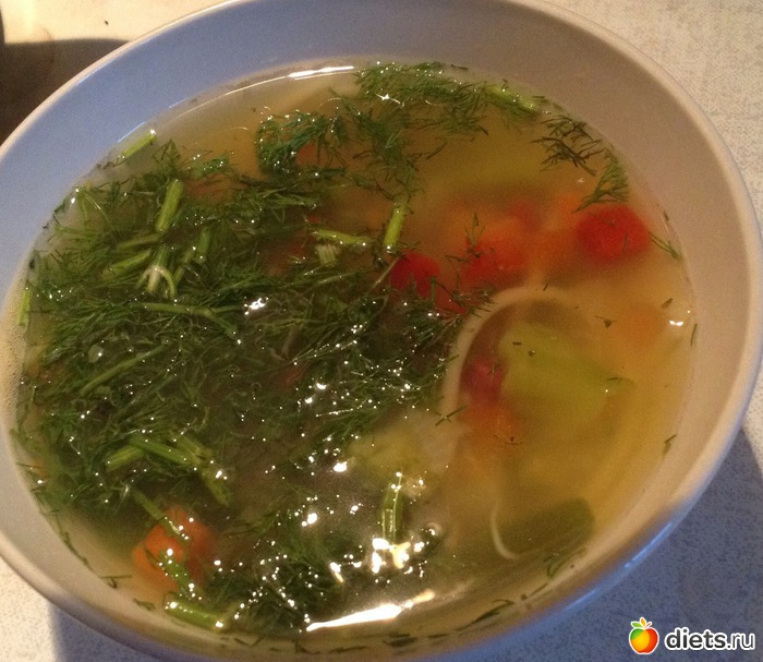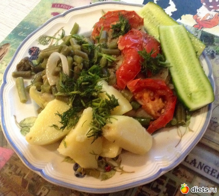 Овощной супчик и тилапия с картошкой, зеленой фасолью, огурчиком-помидорчиком.