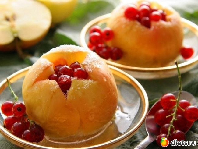 Диетические свойства этого блюда обусловлены не только низкой калорийностью печеных яблок, но и тем, что их с успехом можно применять в диетическом питании для того, чтобы избавиться от лишних килограммов. В основе этого метода лежит опять же высокое содержание калия в печеных яблоках. Калий является антагонистом натрия, который попадает в организм человека с обычной поваренной солью. Всем известно свойство натрия «помогать» накапливать избыточную жидкость в подкожном жировом слое человека, что в свою очередь способствует отложению жира.