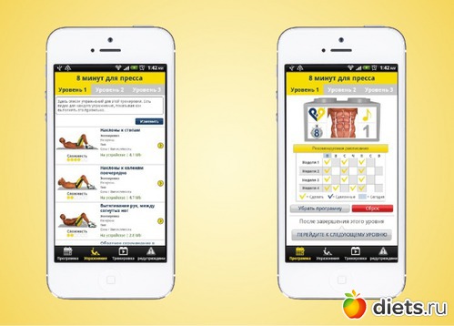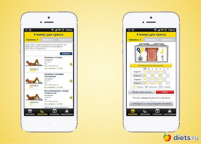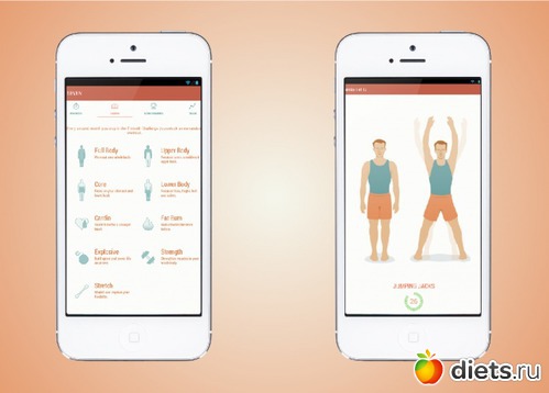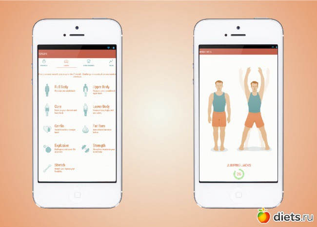 программа для выполнения 7-минутной зарядки основана на принципе циклических упражнений высокой интенсивности, о которой мы писали в этой статье. Преимуществом по сравнению с картинками является голосовое руководство и расчет времени комплекса.