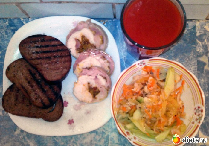 Сегодня я отошел от своего стандарта... Сок, овощной салат, рулет и хлеб, подсушенный на гриле.