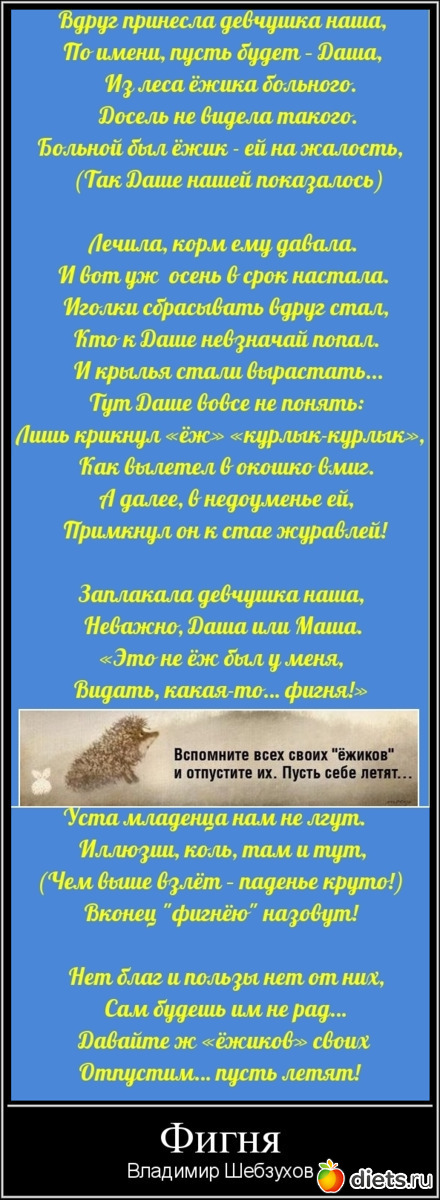 Вдруг принесла девчушка наша, По имени, пусть будет – Даша, Из леса ёжика больного. Не видела досель такого. Больной был ёжик -- ей на жалость, (Так, Даше нашей, показалось) Лечила, корм ему давала. И вот уж осень в срок настала. Иголки сбрасывать вдруг стал, Кто к Даше невзначай попал. И крылья стали вырастать... Тут Даше вовсе не понять:...