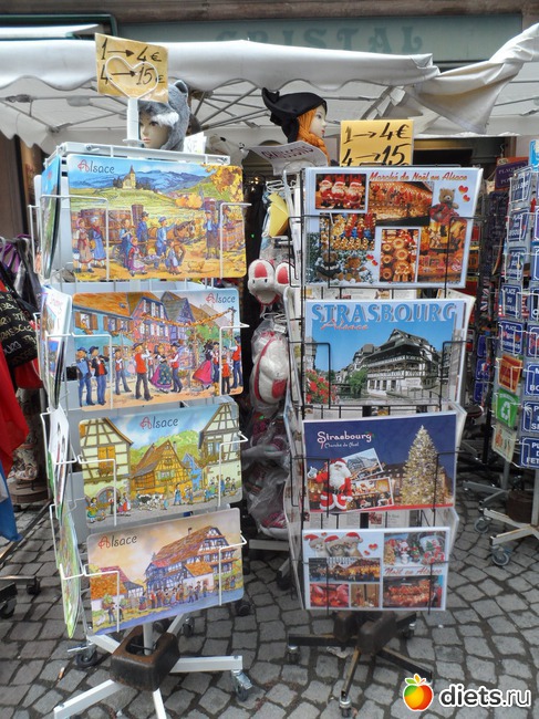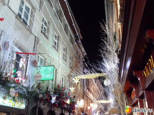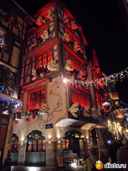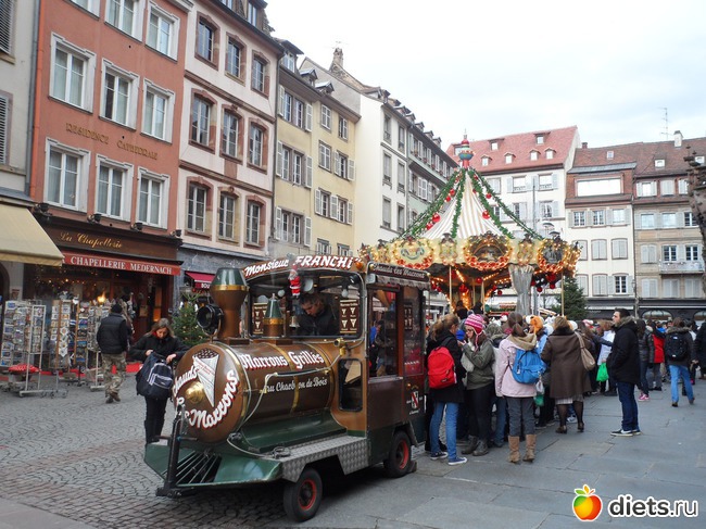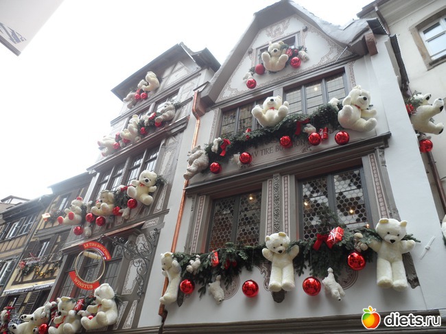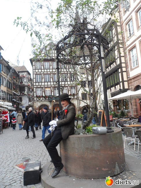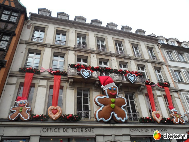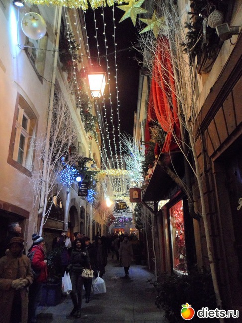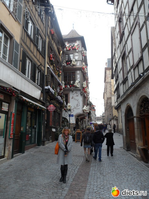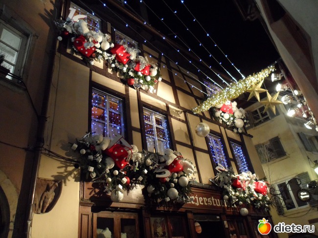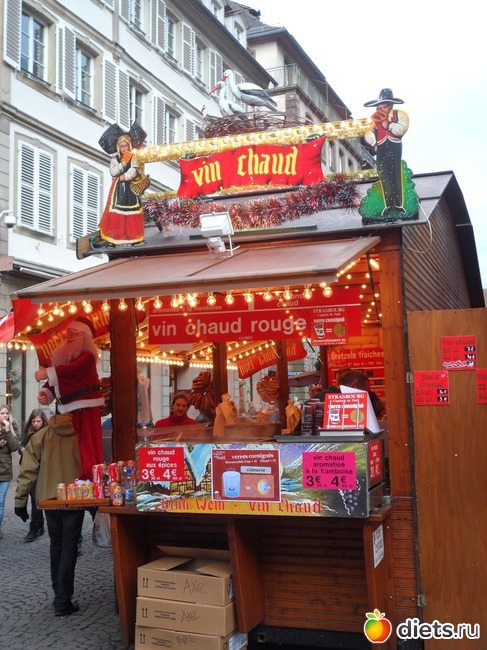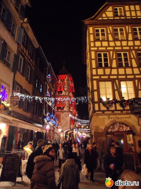Что попробовать: не удивляйтесь, увидев ресторанчики на 3-4 столика. Таких там большинство и в этом их прелесть. Кухня домашняя и очень уютная атмосфера. Если решили быстренько перекусить, то попробуйте Фламмкухен (Flammkuchen) - открытый огненный пирог, рецепт которого родился давным давно в Эльзасских деревнях. Чем-то похож на пиццу, но полегче для желудка))). Многократно мной упомянутый глинтвейн - обязателен к дегустации. Ну а дальше, всё что понравится - немецкие сосиски или колбасы (Knak), квашеная капуста с мясом или рыбой (Choucroute) - подается везде (мне не понравилась ни капуста, ни мясо. Но многие в восторге), Kougelhopf (сладкий кекс), фуа-гра (Foie gras) - шеф повар из Страсбурга придумал рецепт этого паштета из гусиной печени и многое другое.