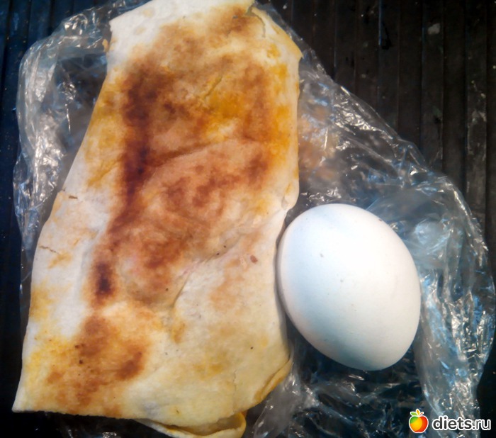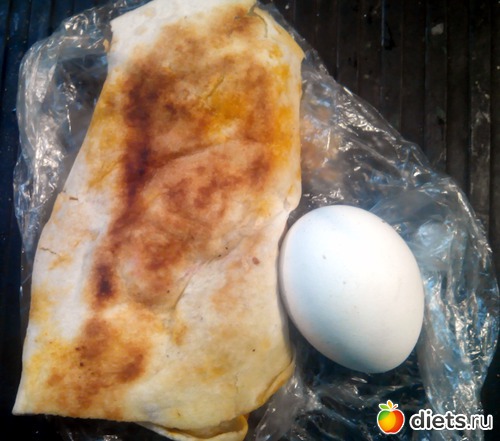 Короче говоря, лаваш разрезается на несколько частей и в каждую их них заворачивается некоторое количество тушеной капусты. Так было в первоисточнике, да и ничего другого под рукой не было. Сделал несколько конвертиков и подсушил их на сковородке с капелькой масла. Лаваш хорош тем, что после температурной обработки сохраняет свою форму.