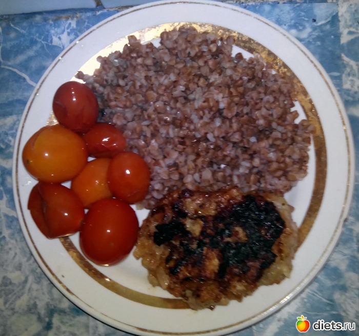 Гречка, котлетка из куриного фарша с луком и помидорки.