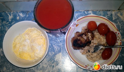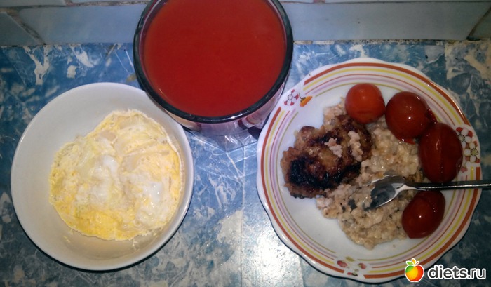 Сок, овсянка с котлетой из куриного фарша и лука и яйцо с луком.
