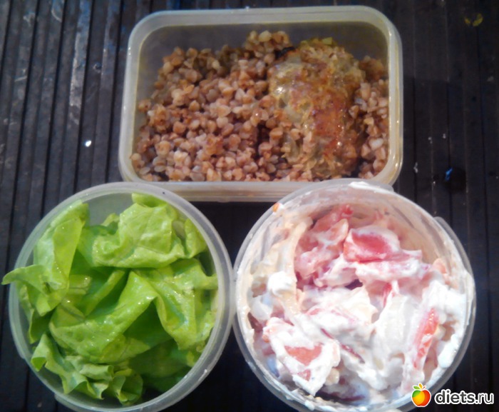 Зеленый салат. Салат из помидорки с луком, заправленный греческим йогуртом (хотел съесть его часиков в десять, но работа не позволила) и гречка с точно такой же котлетой как утром.