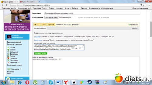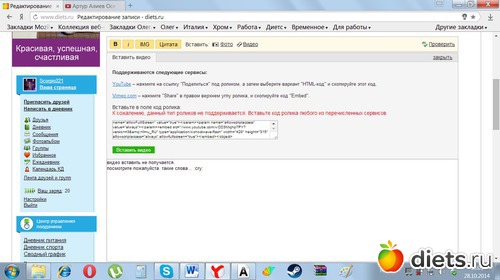 2. Опишите, пожалуйста, пошагово - как Вы вставляете видео? В нашей "Помощи" есть глава, посвященная вставке видео - https://www.diets.ru/help/video.html , возможно, Вы пропускаете какой-то из пунктов?