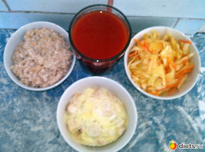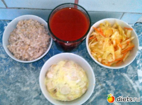 Сок, геркулес, капустный салат и что-то вроде омлета. Нарезал грудку (так ее есть не очень), смешал с яйцом и в микроволновку на пару минут. Вышло вполне съедобно.