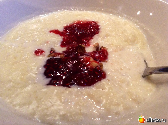 Завтрак - рисовая молочная каша с ложкой малинового варенья, грейпфрутовый сок и кофе.