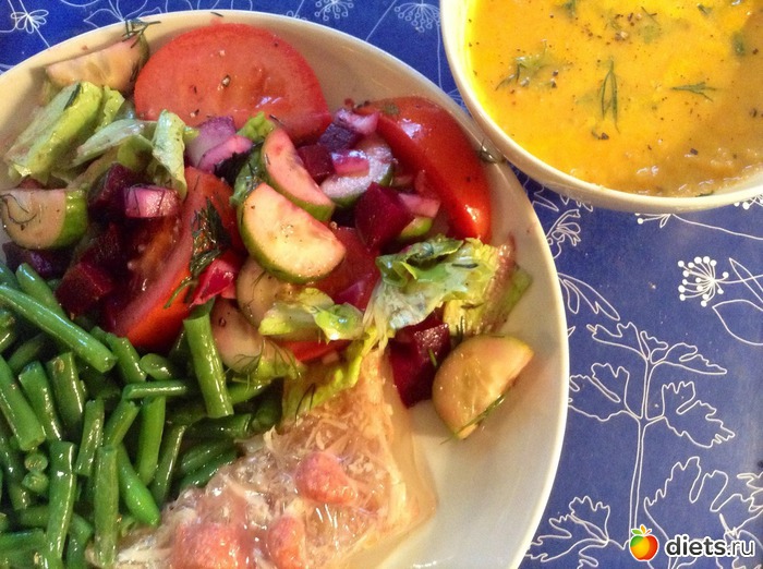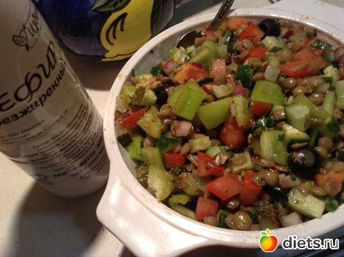 Ужин - чечевица с овощами (помидор, огурец, перец, лук, пара маслин) и обезжиренный кефир.