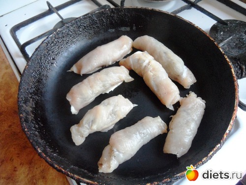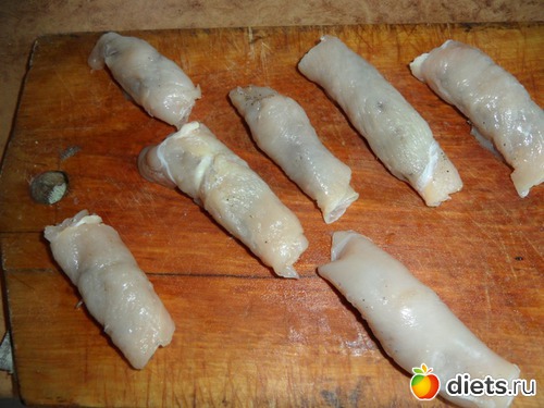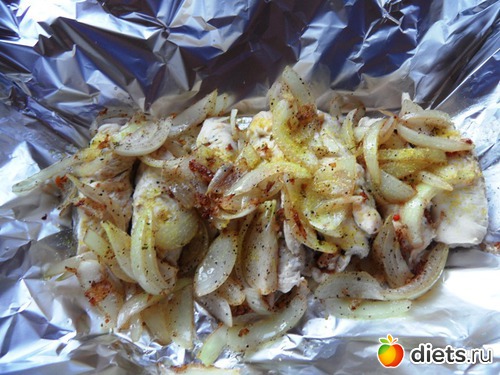 Филе порезала, отбила, посыпала специями и завернула рулетиком. Обжарила на сухой сковороде. Выложила в фольгу.