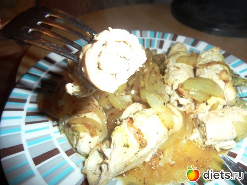 Потребуется 1 куриное филе(половинка), соль, перец, сухой чеснок, сухой укроп, специи по вкусу, 1 луковичка.