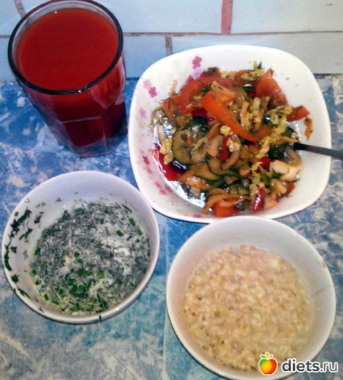 Сок, салат, овсянка и яйцо с зеленью.