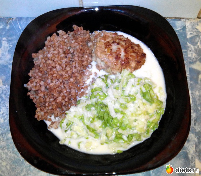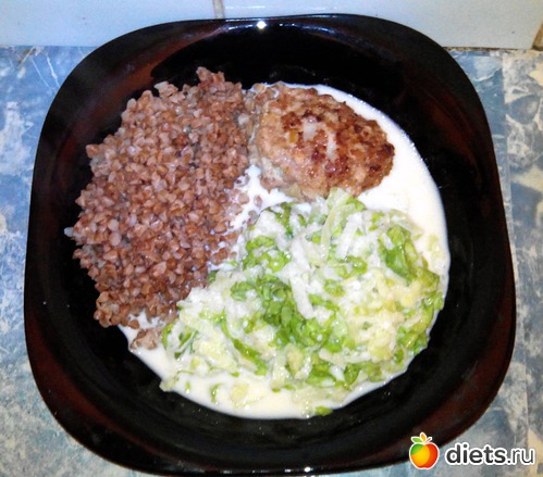 Салат из редьки с ряженкой, гречка и котлетка из куриного фарша.