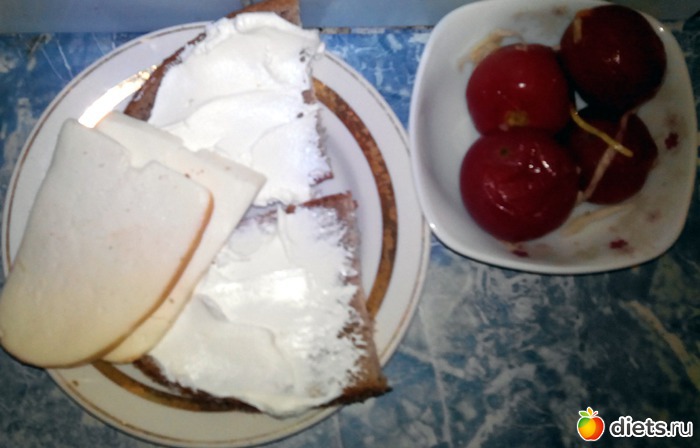 Хлеб, намазанный греческим йогуртом, адыгейский сыр и маринованные помидорки.