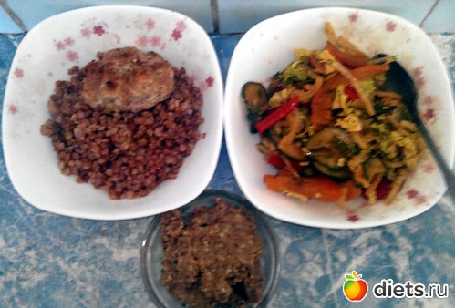 Салат, гречка с котлетой из куриного фарша и хумус из чечевицы.