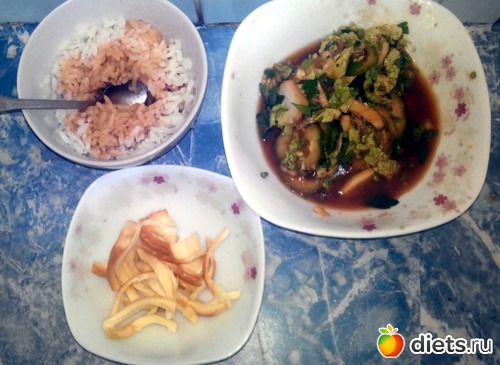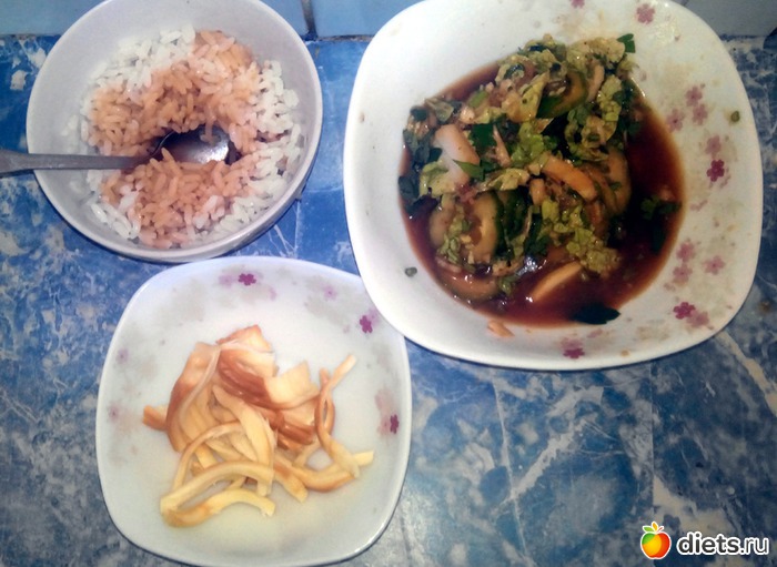 Остатки вчерашнего салата, рис с соевым соусом и сыр-косичка.