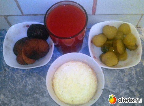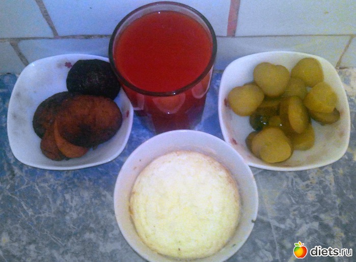 Сок, запеканка из яйца и творога, несколько опять же доморощенных!, крекеров и маринованный огурец.