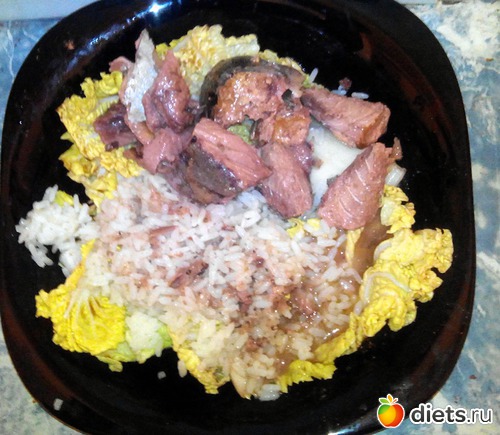 На низ тарелки листики пекинки, сбрызнутые соевым соусом и яблочным уксусом. Посыпано красным перцем. А сверху рис и консервированный тунец. Рис полит соком из банки.
