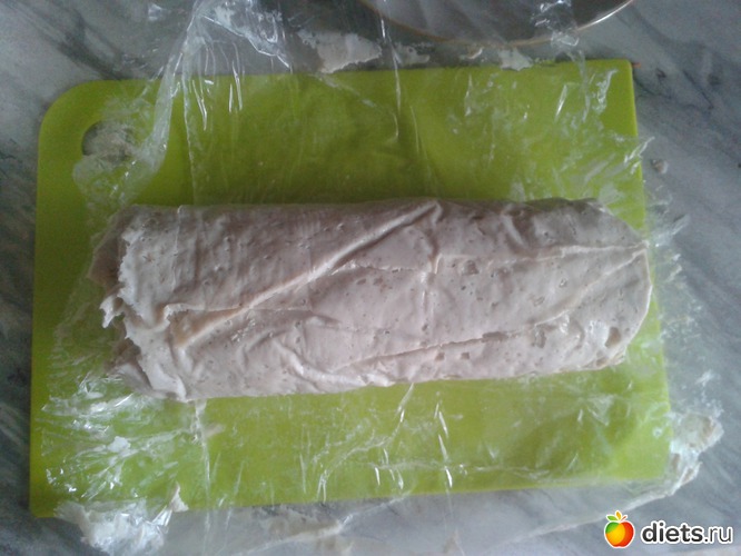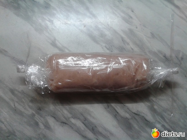 Сначала произвела из него однослойную пленку. Скатала колбасу. Запихала ее уже В рукав. Завязали в 4 руки с мужем, который всю дорогу пытался встрять в процесс приготовления - в изумлении от бурной деятельности среди ночи.