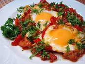 Положить нарезанные томаты и тушить 20-25 минут, пока почти вся жидкость не испариться. Ложкой сделать углубления в овощах и выпустить в них яйца, белок слегка вмешать в смесь. Приправить солью и специями по вкусу. Не перемешивая, держать на огне, пока яйца не будут готовы.