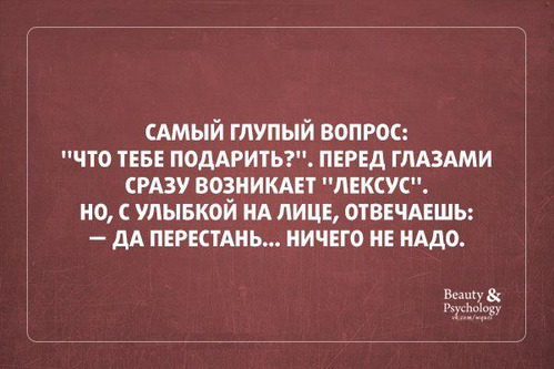 Это, мне кажется, универсальные поводы. Кроме первого. Я предпочитаю, чтобы спрашивали, что мне подарить. Всё равно ведь не угадают, а делать вид, что радуюсь фигне какой-нибудь, терпеть ненавижу.