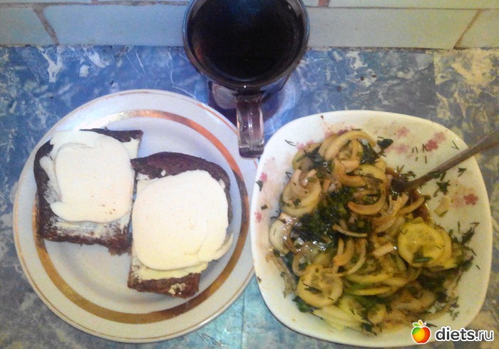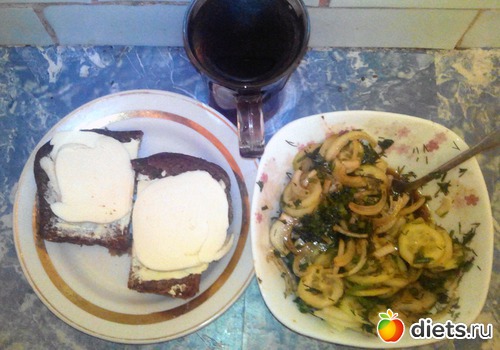 Салат из огурца, лука и зелени. Заправка стандартная. И пара бутеров. Хлеб с маслом и козьим сыром.