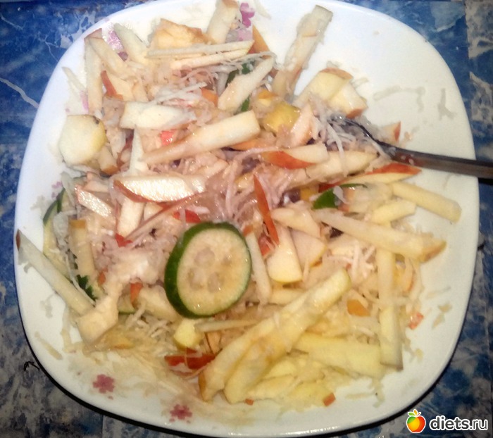 Нарезал яблоко тонкой соломкой, натер на мелкой терке корень сельдерея и нарезал один плод фейхоа. Похоже, совершенно незрелый, ибо довольно кислый. Добавил пару чайных ложек сиропа шиповника.