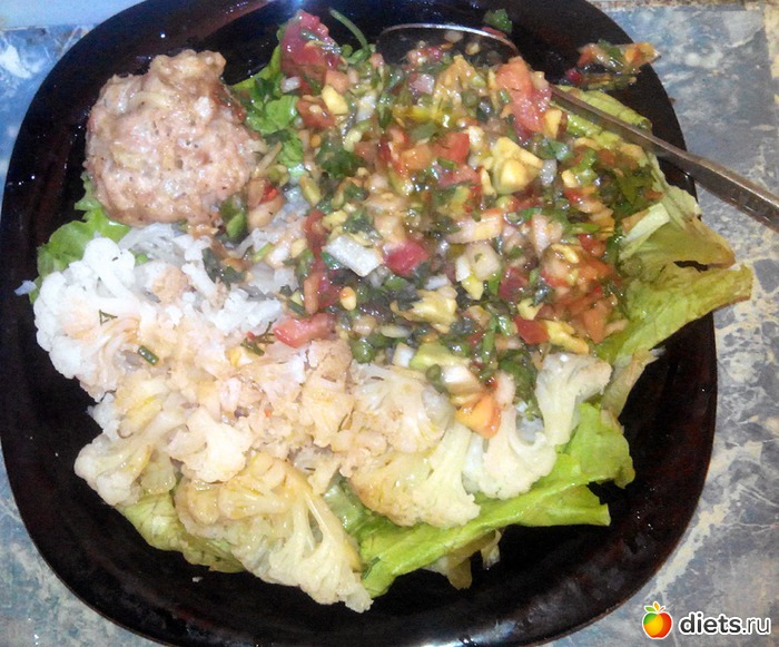 Подложку сделал из листьев салата. Сбланшировал цветной капусты. Котлетка из куриного фарша. И... Нечто, напоминающее гуакамоле. Ну... почти... Взял авокадо (экзотика номер два), добыл мякоть, измельчил. Мелко нарезал помидорку, лук и зелень, добавил соевый соус, яблочный уксус и немного драконьей заправки. Перемешал. Честно говоря, я в некотором недоумении - какое-то авокадо безвкусное... Или его не распробовал...