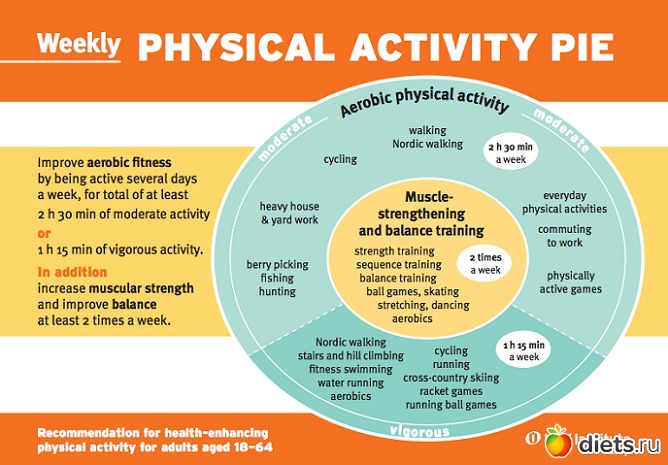 В Финляндии есть научно-исследовательский центр оздоровительной физкультуры The UKK Institute, известный среди врачей (правда тех, которым вообще известны способы оценки уровня здоровья) своим простым и информативным 2-километровым тестом ходьбы, который используется для оценки физического состояния людей в 22 странах. Рекомендации по физической активности они оформили в виде инфографики под названием Physical Activity Pie (2009) (http://www.ukkinstituutti.fi/en/products/physical_activity_pie).