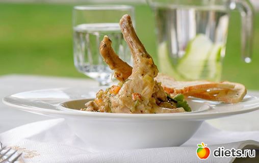 А вот теперь настал черед обжаренных кусочков кролика, возвращаем их в кастрюлю, перемешиваем с овощами, беконом или грудинкой и травами. После не мешаем, даем познакомиться всем ингредиентам в течении 15 минут и только после их знакомства и обмена комплиментами в адрес друг друга, мы заливаем этот благословенный союз бульоном, соли, перчим и еще раз перемешиваем, уменьшаем огонь и прикрываем крышкой. У Вас есть час на поболтать с подругой по телефону, проверить диктант любимого отрока, обвести в программе телепередач драматический сериал красным фломастером и черным фломастером футбольный матч.